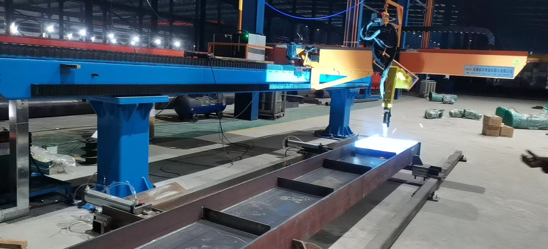 智能焊接在鋼構(gòu)行業(yè)的成功應(yīng)用針對鋼結(jié)構(gòu)中常見的H型鋼等鋼梁工件,威卓設(shè)計(jì)研發(fā)了小龍門智能焊接工作站,焊槍部分使用鋼梁專用焊槍,更適用于鋼梁焊接;搭配傳感器使用,自動尋位識別焊縫,無